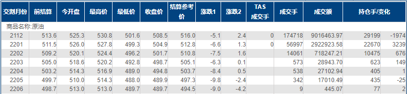 上海原油价格下跌,主力合约2112终盘收于508.5元/桶,跌5.1元/桶,跌幅0.99%。