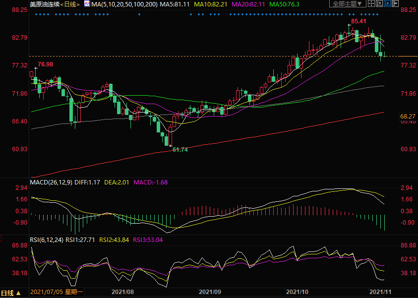 下方初步支撑位关注11月4日低位78.25,进一步关注7月6日高位76.98以及50日均线76.35。