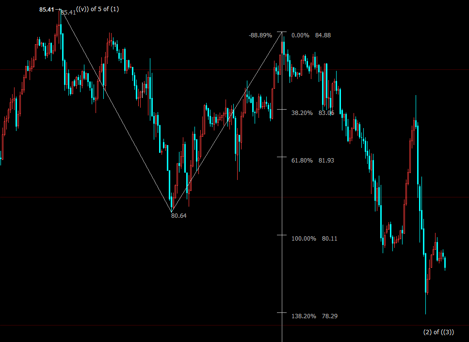 小时图上看,NYMEX原油处于自84.88美元开启的下行Y浪,失守138.2%目标位78.29美元,后市料下探168.2%目标位77.16美元。Y浪子是自85.41美元开启的调整(2)浪的子浪。2浪是自61.74美元开启的上行((3))浪的子浪。