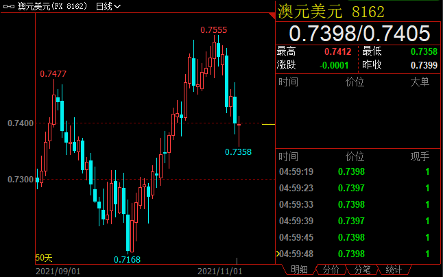 澳洲联储将利率维持在0.1%的历史低位,但取消了关于2024年前不太可能加息的预测,并放弃2024年4月到期公债的收益率目标。但强调指出通胀率仍然过低,没有表现出许多人原本预期的那种鹰派倾向。澳元兑美元收跌1.58%至0.7399,周线结束五连阳。