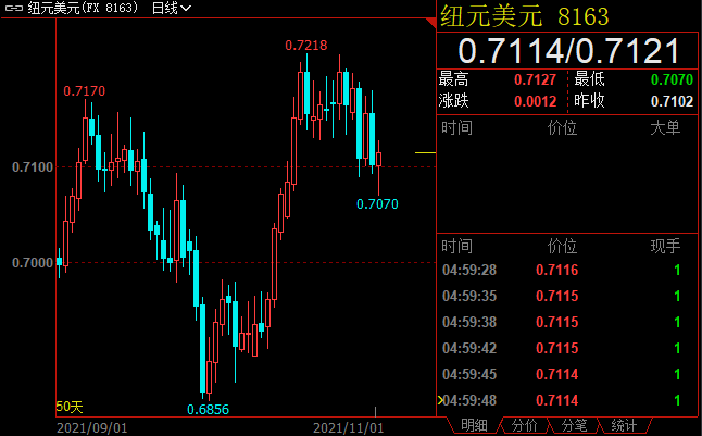 纽元兑美元收跌0.71%至0.7114,汇价在0.72重要整数关口附近反复受阻。此前两周,汇价盘中多次上破该价位,但最终均未能站稳上方。