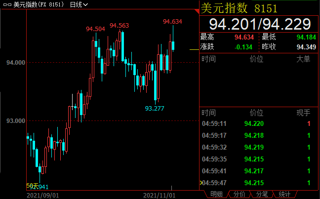 稍早前,美联储宣布了外界期待已久的缩减政策,将削减每月1200亿美元的购债规模,拟在2022年年中彻底结束购债计划。但美联储仍坚持高通胀将被证明是“暂时性”的观点,认为可能不需要快速升息。美元一度承压,但随后受到英镑暴跌提振,美指一度创出2020年9月28日以来新高至94.634。