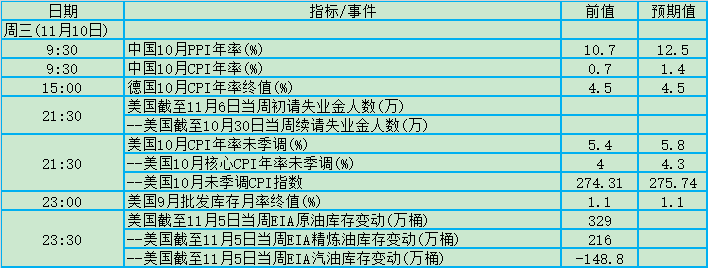 周三(11月10日)关键词:中国CPI、美国初请、美国CPI、EIA