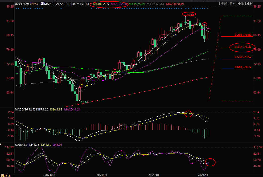 日线级别:高位震荡;均线交织,油价目前正在试图10日均线和21日均线的双重阻力压制,MACD死叉,KDJ有重新结成金叉的趋势,短线走势变数较大,由于上周四(11月4日)的上影线利空信号仍在,在有效突破10日均线82.25前,油价仍有震荡回落的风险。
