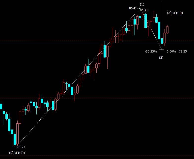 日线上看,NYMEX原油处于自78.25美元开启的上行(3)浪,后市有望升向23.6%目标位83.84美元和38.2%目标位87.29美元。(3)浪是自61.74美元开启的上行((3))浪的子浪。