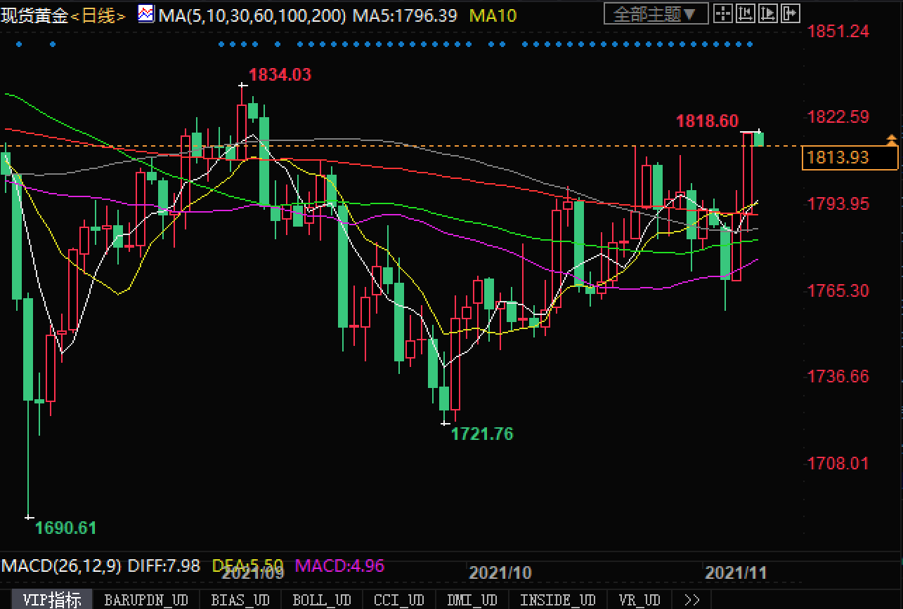 北京时间11月8日09:43,现货黄金报1816.68美元/盎司。