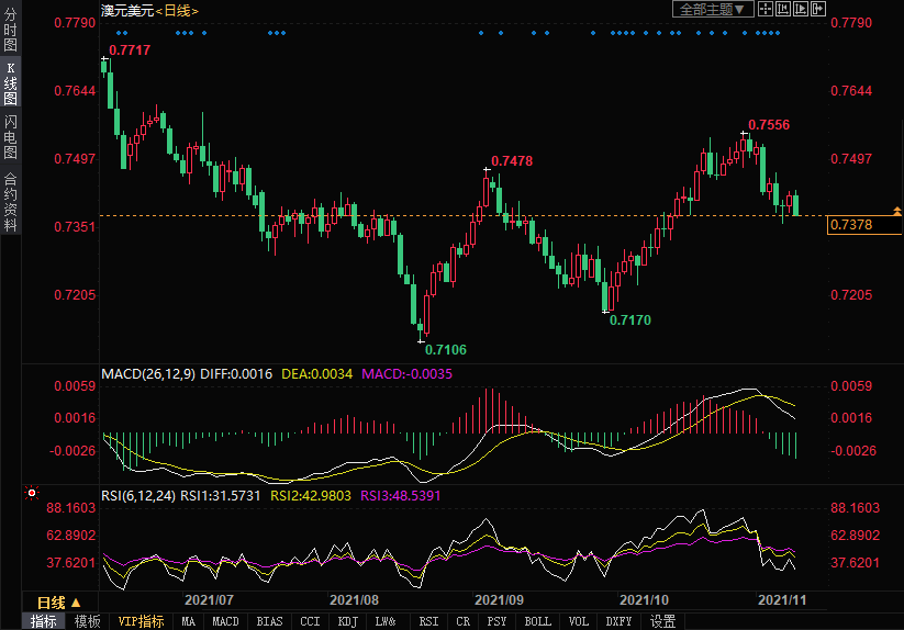 周二(11月9日)澳元兑美元从早些时候的高点0.7430开始下跌,目前跌逾0.6%,尽管亚洲时段公布的澳大利亚商业信心指数表现强劲,但大宗商品全线大跌等因素令澳元持续承压下行。