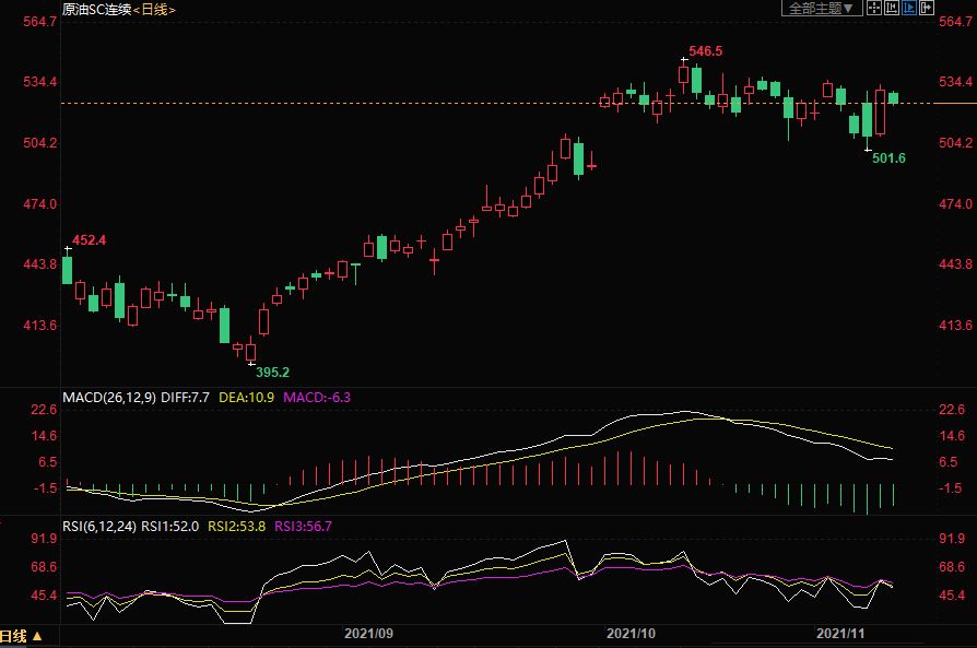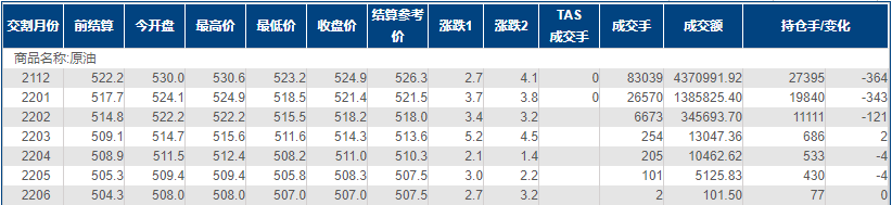 上海原油价格大涨,主力合约2112终盘收于524.9元/桶,涨2.7元/桶,涨幅0.52%。