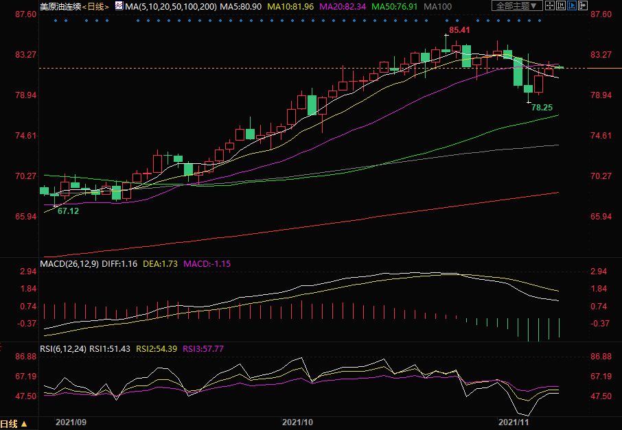 一旦空头重新掌握主动,油价可能率先测试5日均线80.91,再往下10月6日高位79.78以及11月4日低位78.25将提供进一步的支撑。