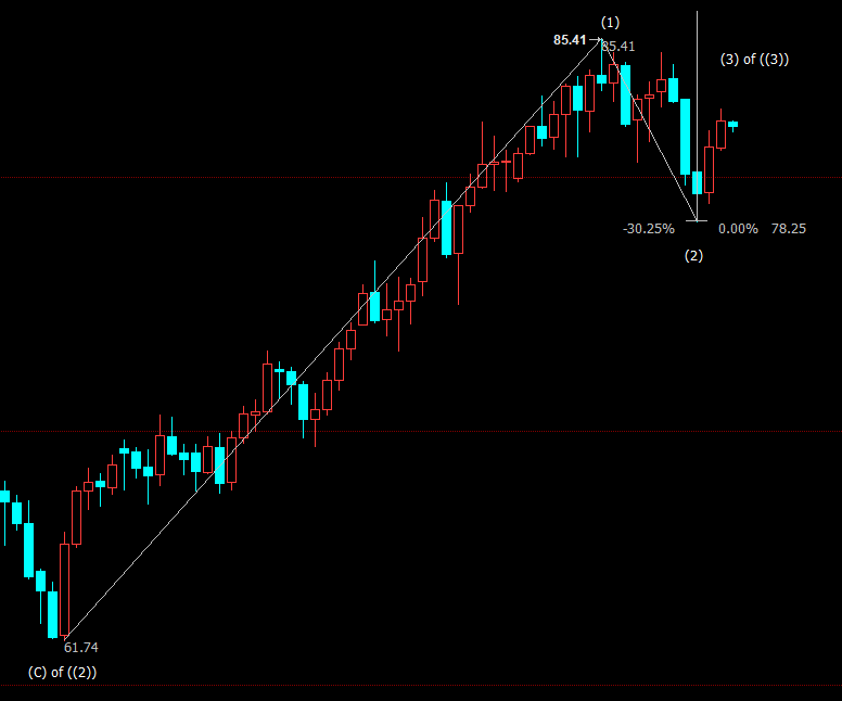 日线上看,NYMEX原油处于自78.25美元开启的上行(3)浪,后市有望升向23.6%目标位83.84美元和38.2%目标位87.29美元。(3)浪是自61.74美元开启的上行((3))浪的子浪。