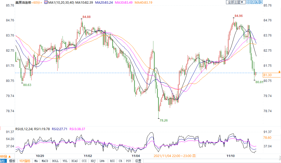 周三(11月10日)美油期货下跌2.81美元,跌幅为3.3%,结算价报81.34美元/桶。布油下跌2.14美元,报收82.64美元/桶。早前EIA库存报告显示,截至11月5日当周,美国原油库存增加100.2万桶,为连续第三周提高,达到8月以来的最高水平。与此同时美国总统拜登表示,在通胀普遍急升的情况下,政府正在寻找降低能源价格的方法,引发油价大幅下行。