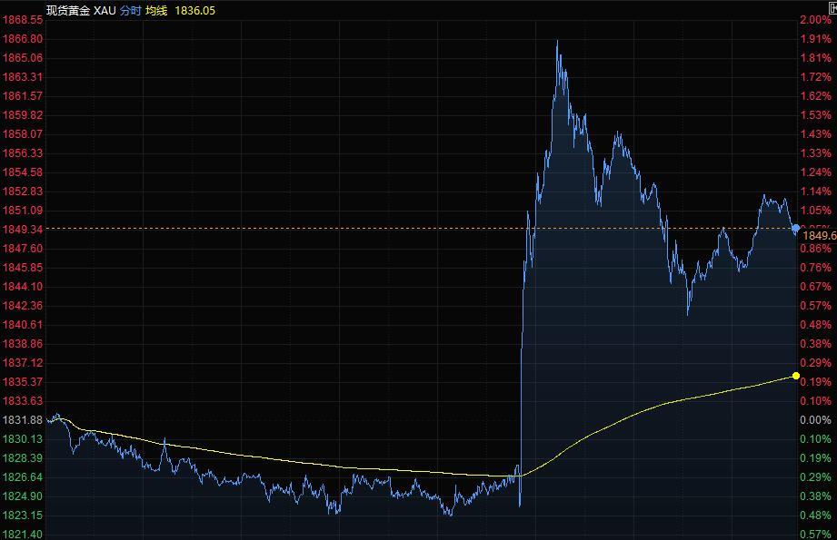 周三黄金攀升至近五个月来最高点,现货黄金一度上涨2%至每盎司1868.55美元,为6月以来最高水平;因数据显示上月美国消费者物价急升,增强了黄金作为通胀对冲工具的吸引力。不过随着美元大涨,尾盘金价涨幅缩窄,回落至1849.6美元/盎司。