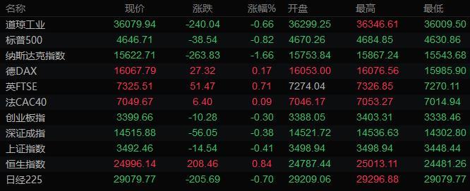 美股收盘情况:标普500指数下跌0.8%,报4646.71点;道琼斯工业平均指数下跌0.7%,报36079.94点;纳斯达克综合指数下跌1.7%,报15622.71点;纳斯达克100指数下跌1.4%,报15985.57点;罗素2000指数下跌1.5%,报2390.323点。