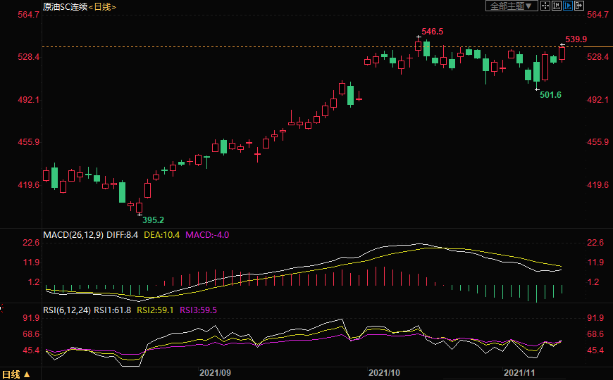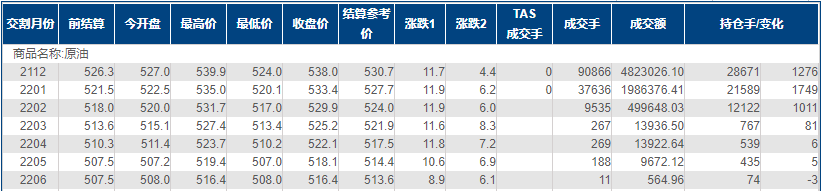 上海原油价格大涨,创三周新高,主力合约2112终盘收于538.0元/桶,涨11.7元/桶,涨幅2.22%。