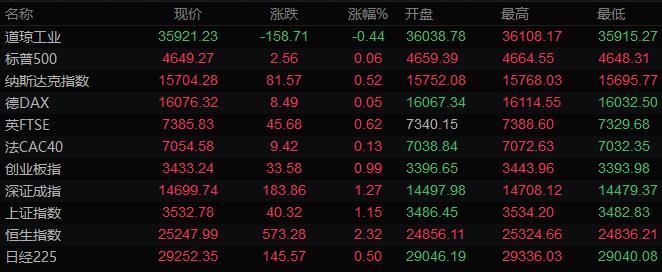 美股收盘情况:标普500指数上涨不到0.1%,报4649.27点;道琼斯工业平均指数下跌0.4%,纳斯达克综合指数上涨0.5%,纳斯达克100指数上涨0.3%,罗素2000指数上涨0.8%。