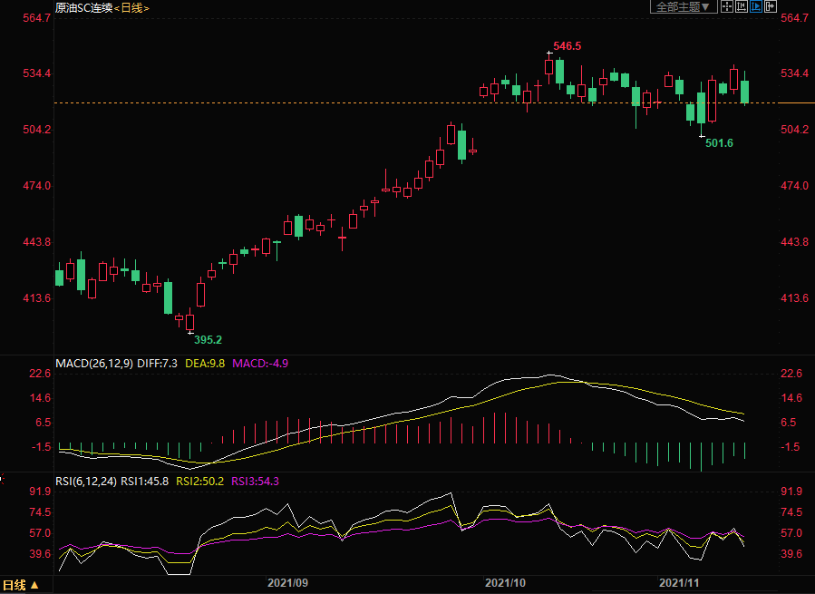 上海原油价格下跌,主力合约2112终盘收于519.3元/桶,跌11.4元/桶,跌幅2.15%。