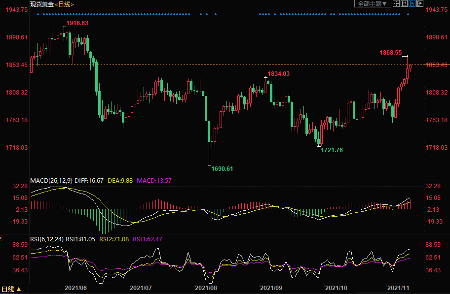 周四(11月11日)现货黄金小幅上涨,短线金价涨势如虹,但需要警惕超买信号,建议保守者观望,激进者继续低位做多。