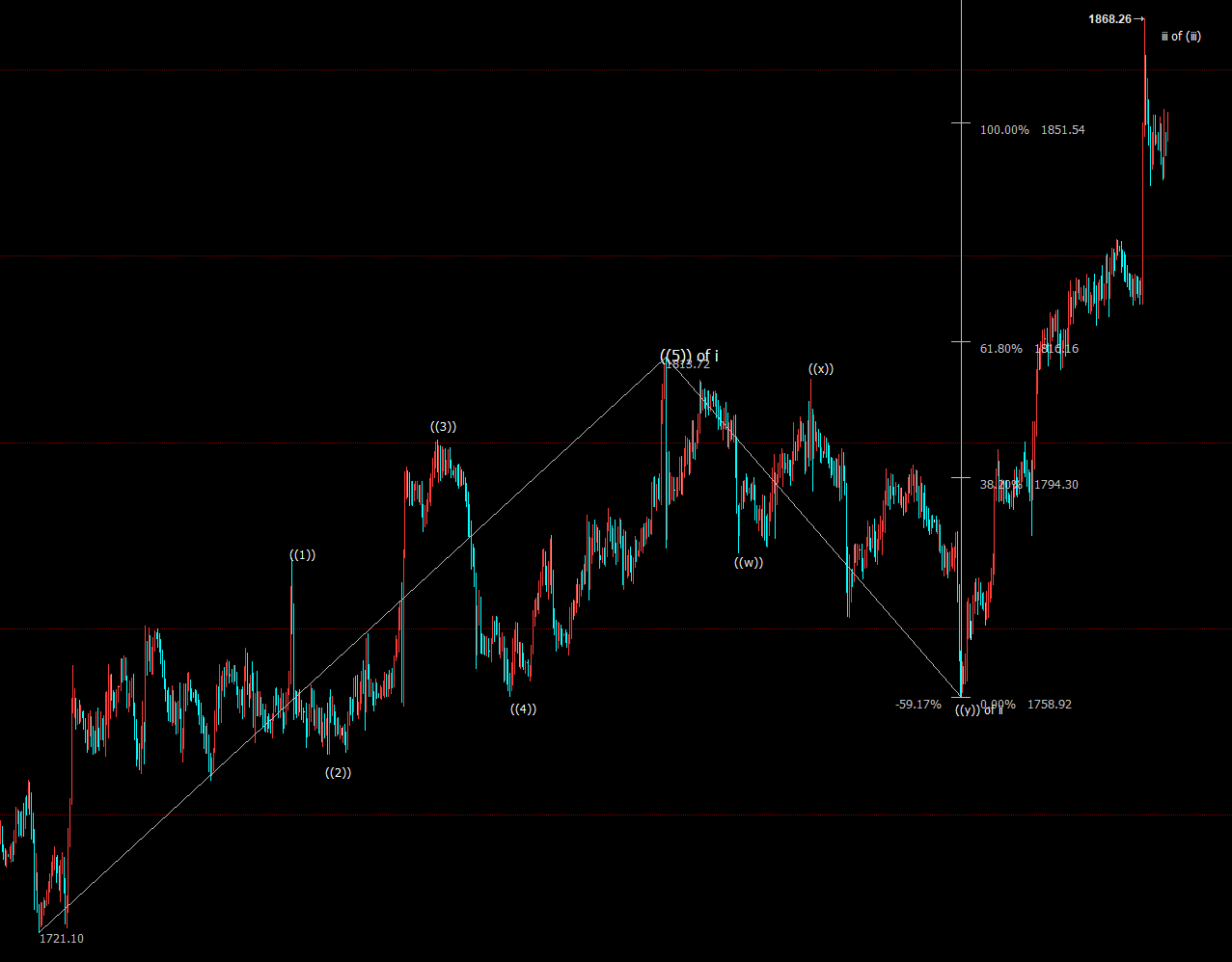 小时图上看,金价处于自1759美元开启的上行iii浪,后市上看123.6%目标位1873美元和138.2%目标位1887美元。iii浪是自1721美元开启的上行(iii)浪的子浪。