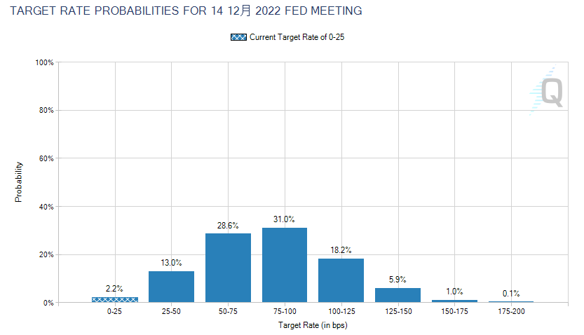 CME“联储观察”工具最新数据显示,美联储在2022年6月至少加息25个基点的概率为68.8%,年底之前累计加息至少75个基点(三次)的概率为56.2%。10月通胀数据公布前,市场预计美联储2022年加息两次。