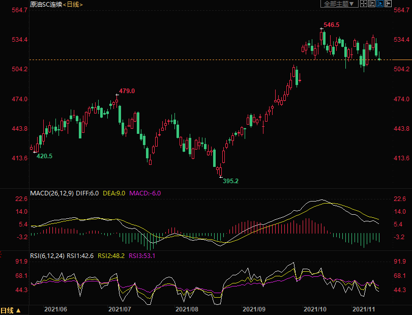 周五(11月12日)上海原油价格下跌,主力合约2112终盘收于514.7元/桶,跌12.0元/桶,跌幅2.28%,市场押注美联储将提前加息以抑制通胀,这推动美元继续上涨,并施压大宗商品价格。