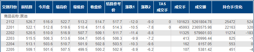上海原油价格下跌,主力合约2112终盘收于514.7元/桶,跌12.0元/桶,跌幅2.28%。