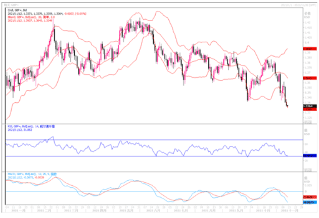 11月11日英镑兑美元一度刷新2021年以来的最低水平1.3358。英国国家统计局公布的数据显示,英国经济在9月份增长0.6%,但前几个月的估值被修正得更低,使得国内生产总值(GDP)比英国进入第一次新冠封锁前不久的2020年2月萎缩0.6%。英国经济在7-9月期间增长了1.3%。这标志着从上一季度报告的5.5%的增长急剧减速,比预期的1.5%还要糟糕。在11月的政策会议上,英国央行将其指标利率维持在0.1%不变,此前曾暗示可能提高利率,结果令市场相当失望。市场现在预计12月升息的可能性很高,但仍存在较高的不确定性。此外,英国制造业和工业生产数据也低于共识估计,人们还担心英国政府将触发《北爱尔兰协议》第16条,这些因素的组合对英镑起到了不利作用。与此同时,日内汇价的突然下跌可能归因于1.3400整数以下的一些技术性抛售,而盘中的技术超卖帮助英镑兑美元从日波动低点迅速反弹。即便如此,风险仍然偏向看跌,任何上涨或都将被视为卖出的机会。上方阻力位关注1.3433、1.3486、1.3557,下方支撑位关注1.3364、1.3312、1.3225。