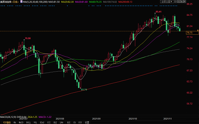 北京时间11月15日20:25,美原油期货价格报79.75美元/桶。