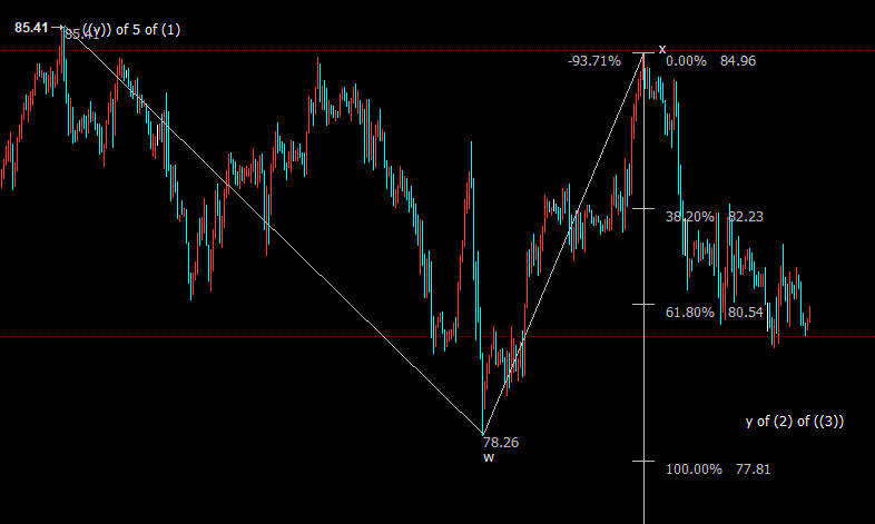 小时图上看,NYMEX原油处于自84.96美元开启的下行y浪,料跌破76.4%目标位79.50美元,并下探85.4%目标位78.85美元。y浪是自85.41美元开启的调整(2)浪的子浪。(2)浪是自61.74美元开启的上行((3))浪的子浪。