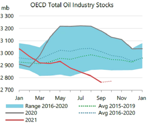 9月份,经合组织国家的工业库存减少了5100万桶,比五年平均水平低2.5亿桶,为2015年初以来的最低水平。10月份的初步数据显示略有增长。