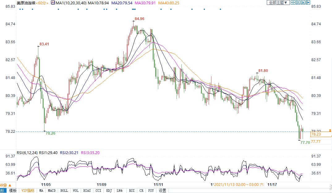 周三(11月17日)美油尾盘下跌3.13%,报收78.23美元/桶;布油下跌2.69%,报收80.21美元/桶。交易员表示,市场最近的走势表明,基金正在押注未来几个月供应开始超过需求的可能性加大,近期期货价格大幅下跌,表明基金正在结清多头头寸。同时此前石油输出国组织(OPEC)和国际能源署(IEA)警告称,供应即将过剩,欧洲新冠病例的增加加剧了需求复苏的下行风险。