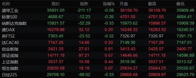 美股收盘情况:标普500指数下跌0.3%,报4688.67点;道琼斯工业平均指数下跌0.6%,报35931.05点;纳斯达克综合指数下跌0.3%,报15921.57点;纳斯达克100指数基本持平,报16308.07点;罗素2000指数下跌1.2%,报2377.008点。