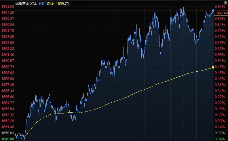黄金价格周三反弹,现货黄金尾盘上涨0.91%,至每盎司1867.48美元,此前在连涨七日后连续两日走低;因通胀担忧推动投资者买入避险黄金,未受美元走强的影响。