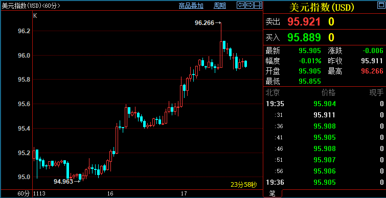北京时间19:35,现货黄金上涨0.56%至1861.05美元/盎司;COMEX期金主力合约上涨0.51%至1863.6美元/盎司;美元指数下沉0.05%至95.907。