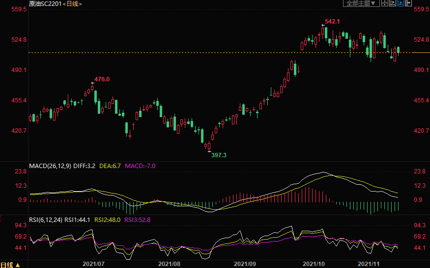 国际能源署发布了11月份《石油市场月度报告》。报告认为,随着国际油价上涨,美国石油产量增加,11月和12月全球石油日均供应量将增加150万桶,其中美国日均供应量增长40万桶。美国石油学会数据显示,截止11月12日当周,美国商业原油库存4.138亿桶,比前周增加70万桶,汽油库存减少280万桶,馏分油库存增加10万桶。技术面,油价震荡转弱。操作建议:震荡偏空思路操作。