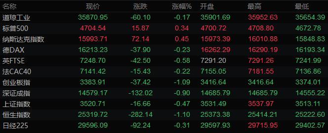 美股收盘情况:标普500指数上涨0.3%,报4704.54点;道琼斯工业平均指数下跌0.2%,报35870.95点;纳斯达克综合指数上涨0.5%,报15993.71点;纳斯达克100指数上涨1.1%,报16482.97点;罗素2000指数下跌0.6%,报2363.589点。