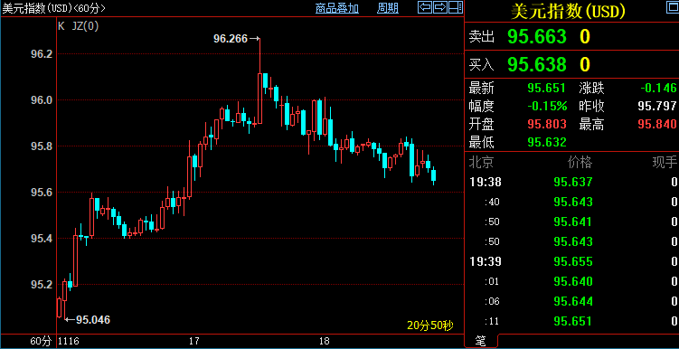 北京时间19:38,现货黄金下跌0.23%至1863.26美元/盎司;COMEX期金主力合约下跌0.28%至1865.0美元/盎司;美元指数下跌0.14%至95.655。