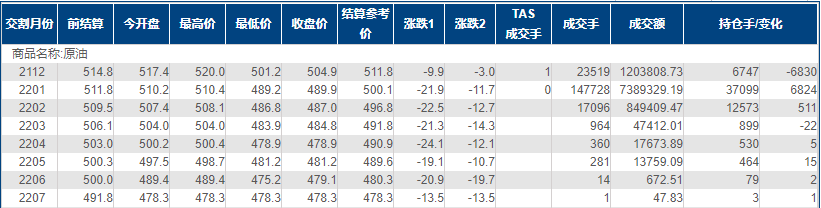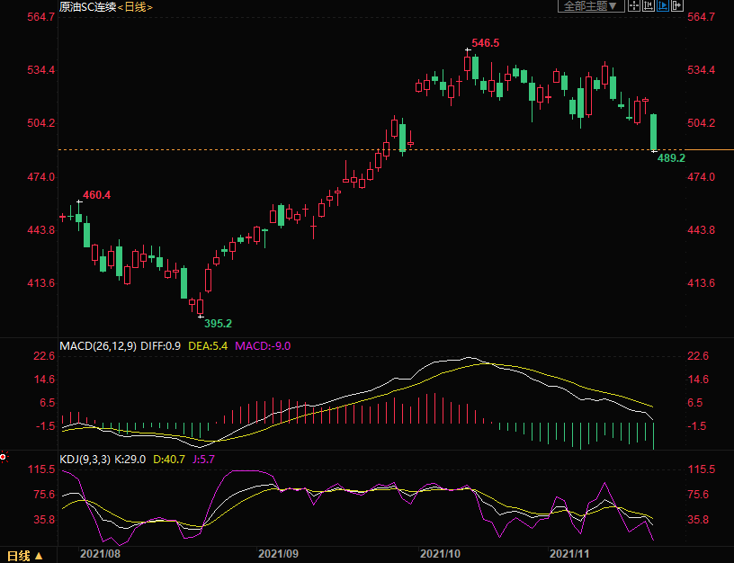 上海原油价格大跌,创六周新低,主力合约2201终盘收于489.9元/桶,跌21.9元/桶,跌幅4.28%。