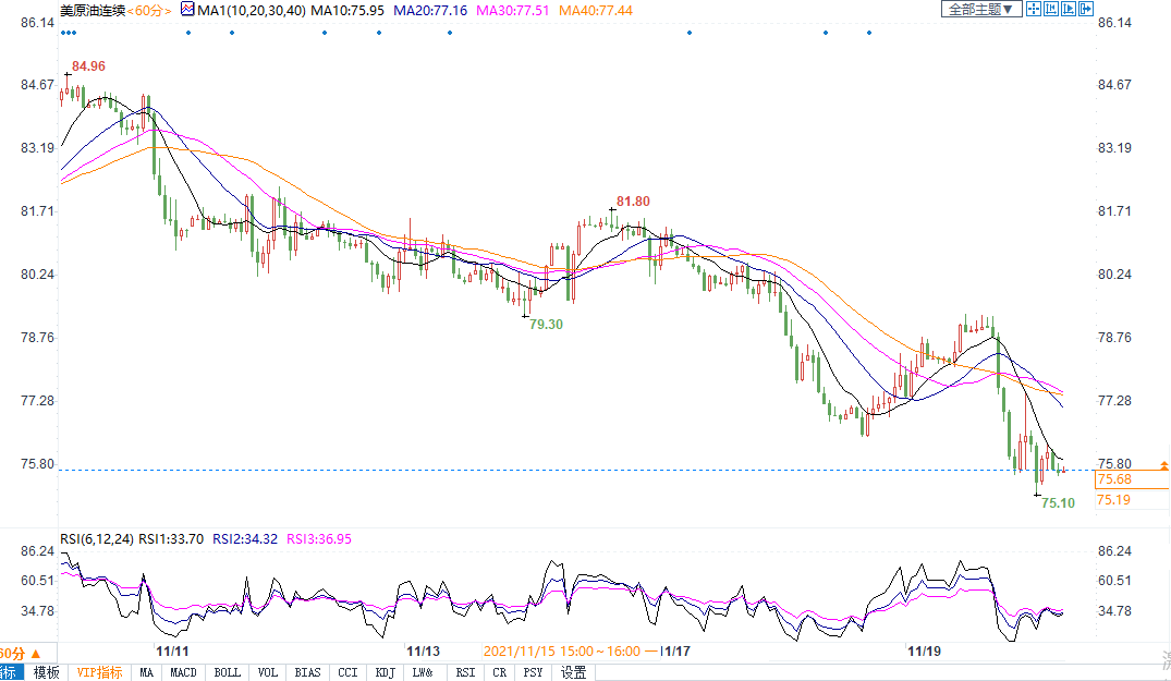 周五(11月19日)布油尾盘大跌3.36%,报收78.51美元/桶;美油下跌3.48%,报收75.68美元/桶。两大指标原油本周都连续第四周下跌,为自2020年3月以来首次。欧洲疫情告急引发市场对需求受创的担忧,使得周四刚刚反弹的原油价格掉头下行,盘中一度跌逾4%。