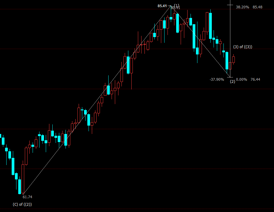 小时图上看,NYMEX原油可能自76.44美元开启上行(3)浪走势,上方阻力位看向23.6%目标位82.03美元。(3)浪是自61.74美元开启的上行((3))浪的子浪。