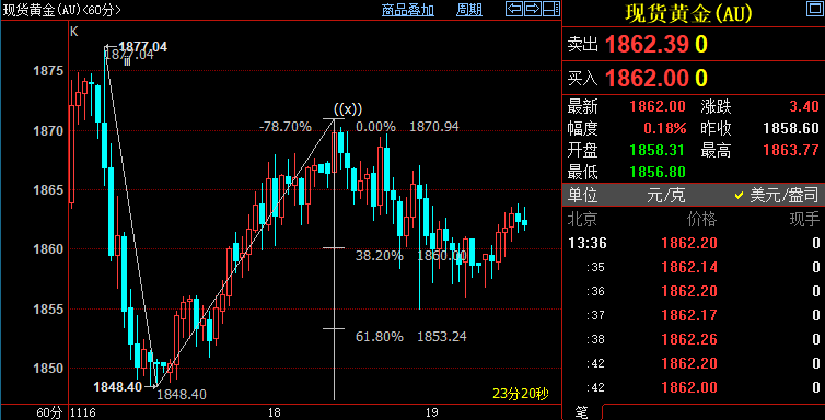 北京时间13:42,现货黄金上涨0.19%至1862.50美元/盎司;COMEX期金主力合约上涨0.16%至1864.3美元/盎司;美元指数上浮0.10%至95.620。