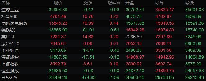 美股收盘情况:标普500指数上涨0.2%,报4701.46点;道琼斯工业平均指数基本持平,报35804.38点;纳斯达克综合指数上涨0.4%,报15845.23点;纳斯达克100指数上涨0.4%,报16367.81点。