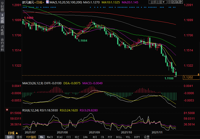 周三(11月24日)欧元兑美元继续下跌,创2020年7月以来低点,此前一项调查显示德国11月企业信心恶化,且美国至11月20日当周初请失业金人数创1969年来新低。