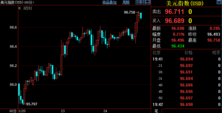 北京时间19:41,现货黄金下沉0.01%至1788.91美元/盎司;COMEX期金主力合约上涨0.29%至1791.5美元/盎司;美元指数上涨0.21%至96.686。