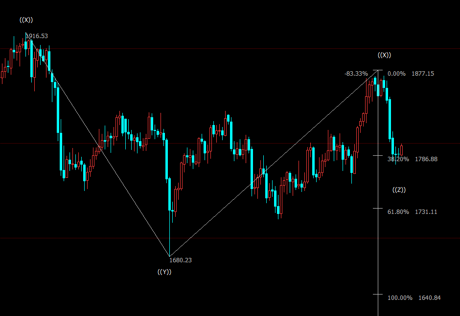 日线图上看,金价处于自1877美元开启的下行((Z))浪,已经跌破38.2%目标位1787美元,并进一步下探61.8%目标位1731美元。((Z))浪是自2075美元开启的调整IV浪的子浪。