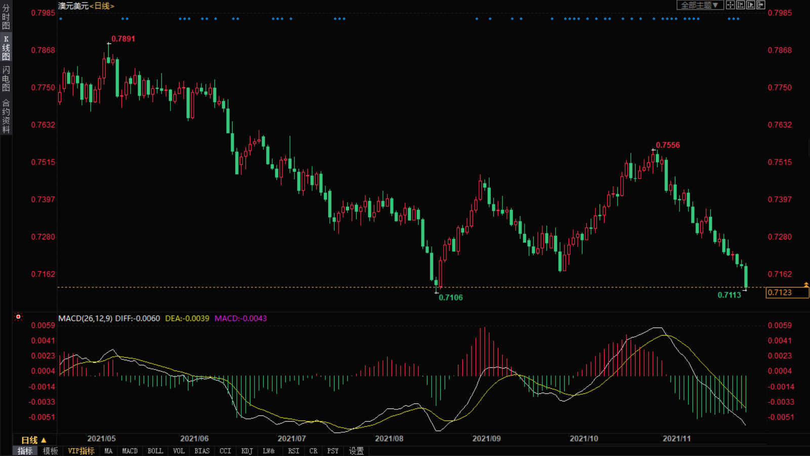 澳元兑美元周线下跌1.55%,报收于0.7123。澳元兑美元维持震荡走低的态势,周五跟随市场空头情绪,大跌近0.93%,周线四连跌,一度创近三个月新低。
