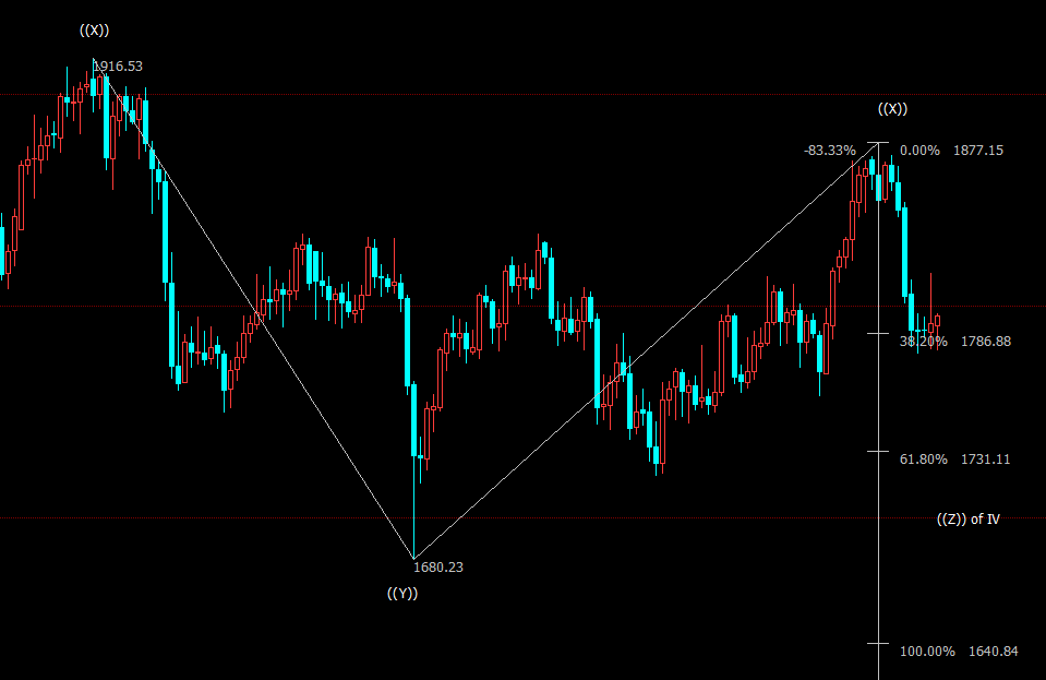 日线图上看,金价处于自1877美元开启的下行((Z))浪,已经跌破38.2%目标位1787美元,并进一步下探61.8%目标位1731美元。((Z))浪是自2075美元开启的调整IV浪的子浪。
