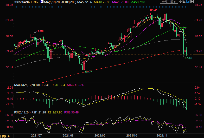 日线级别:油价在午后再度大幅下跌,Moderna首席执行官此前表示现有疫苗很难对付Omicron,这一消息再度引发市场恐慌情绪。