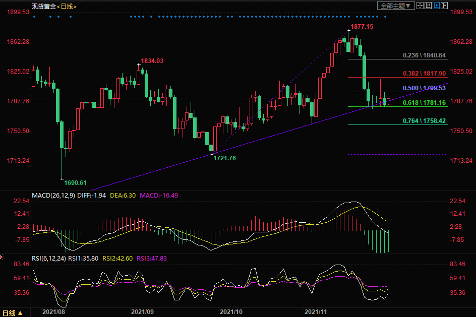 如果有效跌破11月24日低位的支撑1778.70,则进一步看向6月17日低位1767.35以及76.4%回撤位1758.42。