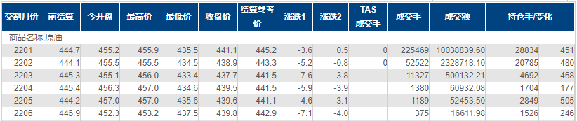 上海原油价格下跌0.81%,主力合约2201终盘收于441.1元/桶,跌3.6元/桶。
