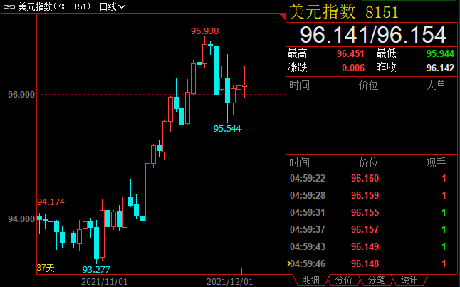 疫情给全球央行收紧政策的前景蒙上了阴影,美元指数收高0.15%至96.148。但尽管美国11月就业增长显著放缓,数据也显示出之前两个月增幅被上修,其他分项指标总体表现不错,表明美联储加速缩减资产购买的计划和明年多次加息的预期保持不变。